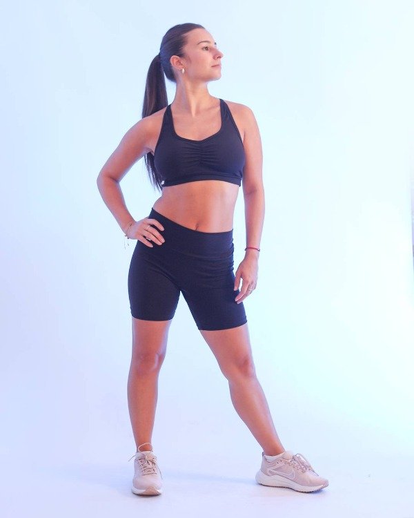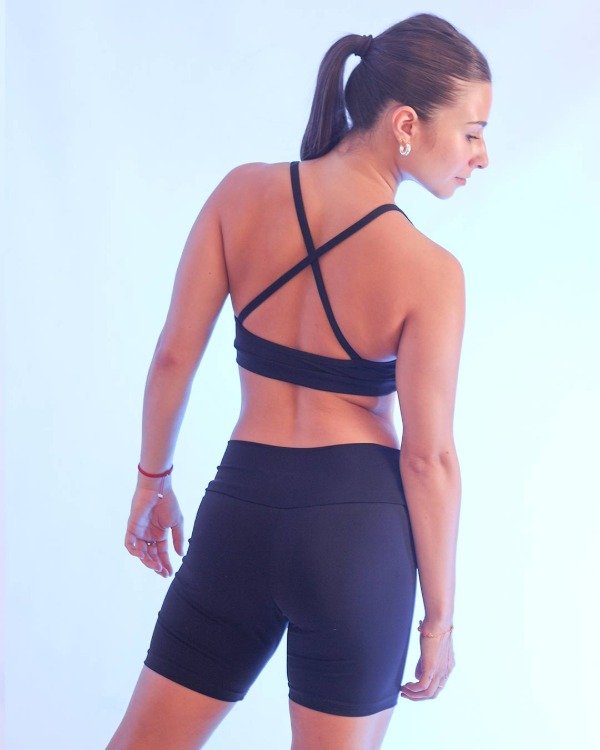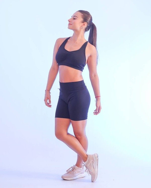• Top: Escote con detalle fruncido que realza la figura y tirantes cruzados para mayor estabilidad en ejercicios de impacto.