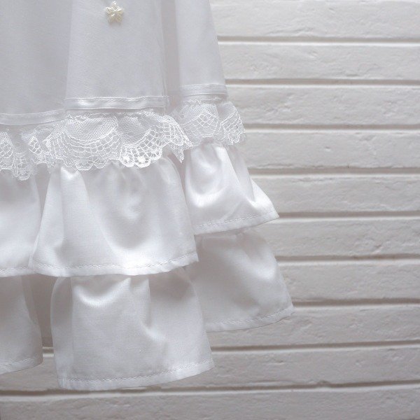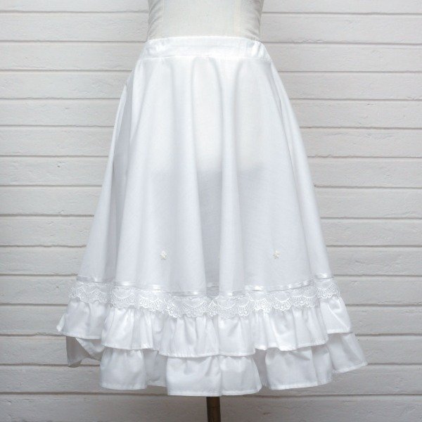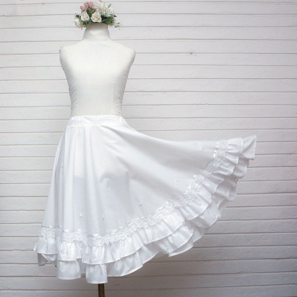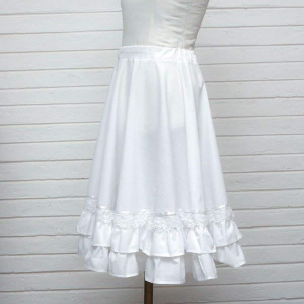 Elige la comodidad del algodón sin renunciar a la belleza. Con un detalle de triple volado en el ruedo, uno de ellos en puntilla de encaje, esta falda añade un extra de romance a tus ensayos.